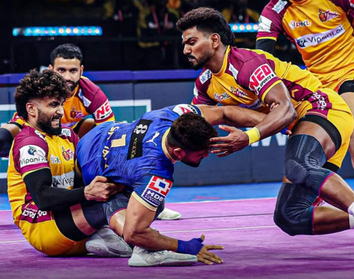 Bharat Hooda marked his 100th PKL game, registering 20 points, including 16 raid points and four tackle points. Vijay Malik also contributed with eight points on the night.