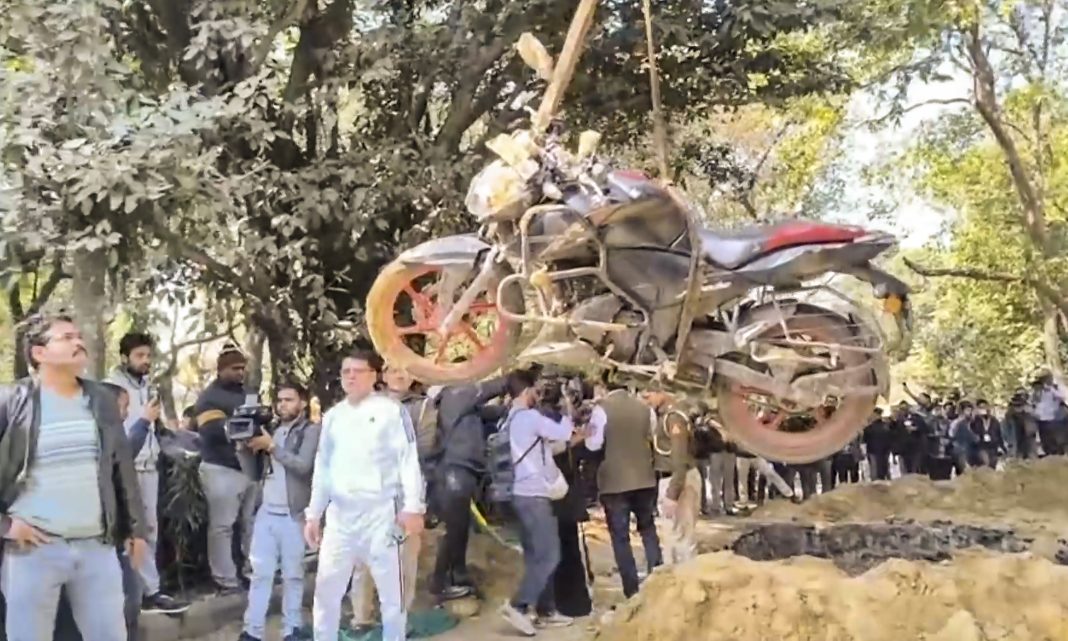 “The guard then alerted a labourer, identified as Yogesh, who looked into the ditch and noticed that the motorcycle’s headlight was on and a human figure was visible inside,” the officer said.