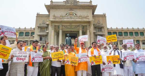 The protest was led by state BJP President B Y Vijayendra, Leaders of Opposition in the Assembly and Council R Ashoka and Chalavadi Narayanaswamy, Union Minister Shobha Karandlaje, and several party legislators and leaders.