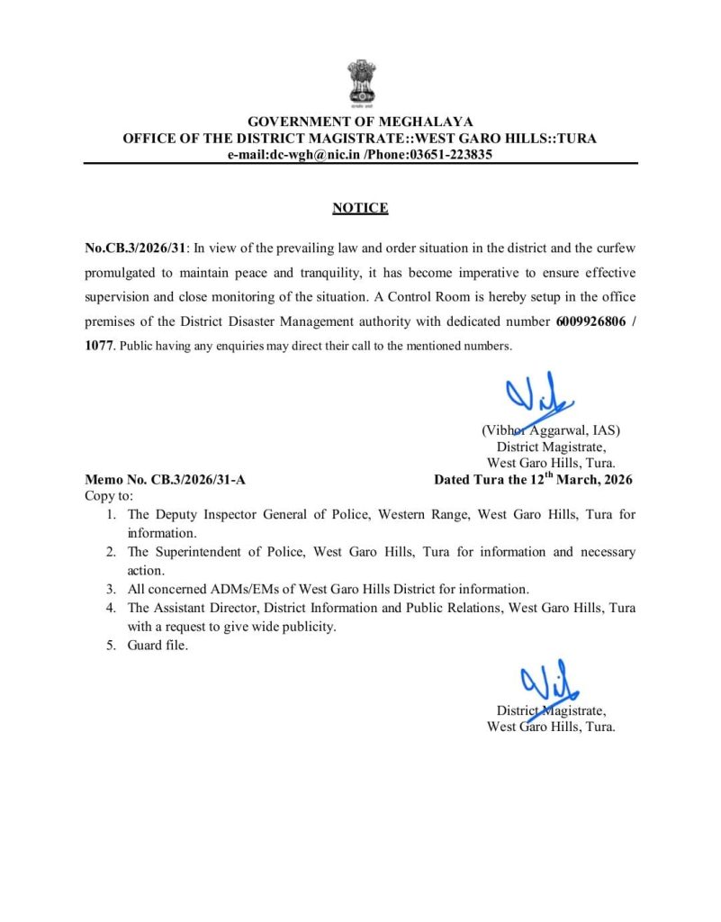 According to a notice issued by the Office of the District Magistrate, Vibhor Aggarwal, IAS, the Control Room has been established at the office premises of the District Disaster Management Authority in Tura. The facility has been set up to assist the public and to address any queries related to the prevailing situation in the district.