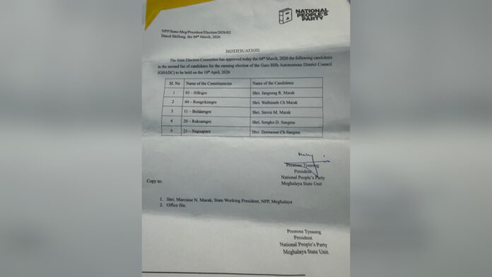 Shillong, March 6: The National People’s Party (NPP) has announced another five candidates for the upcoming elections to Garo Hills Autonomous District Council (GHADC).