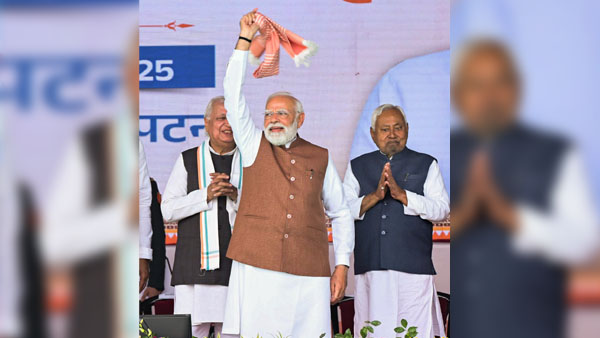 Patna, Nov 20 : The swearing-in ceremony of the new NDA government at Patna’s Gandhi Maidan was a grand affair, attended by political luminaries including Prime Minister Narendra Modi whose waving of a ‘gamchha’ stole the show, triggering a roar from a section of the three lakh-odd crowd.