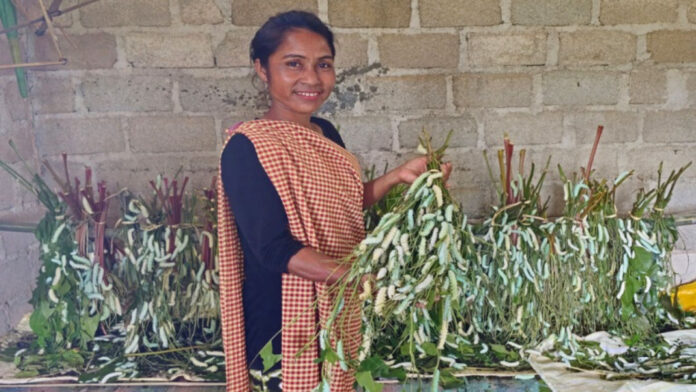 Taimong’s fortunes began to change in 2014, when she received formal training in eri silkworm rearing, enabling her to adopt scientific practices that improved cocoon production and quality. In 2016, she undertook weaving training, which helped her refine her craftsmanship and diversify her income. Her biggest breakthrough came through the Silk Samagra-II scheme of the Central Silk Board, under which she received a modern rearing house. This allowed her to conduct six to seven rearing cycles a year, supported by her castor and tapioca plantations that provide feed throughout the year.