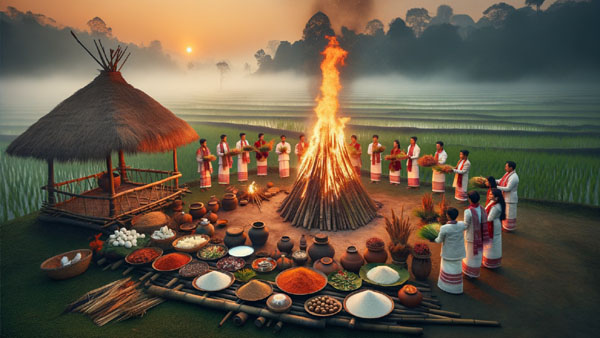 Equally significant to Uruka Night is the construction of the bhelaghar, a modest hut made from bamboo, hay, and other natural materials. Built collectively by members of the community, the bhelaghar serves as both a physical and symbolic centre of the celebration. Its construction is itself an exercise in cooperation, requiring shared effort and mutual participation. Throughout the night, the bhelaghar becomes a space for singing, dancing, storytelling, and laughter, embodying the joy that follows the completion of hard labour. At the end of the festivities, the hut is ceremonially burned, a ritual act that signifies the release of negative energies associated with the past year and the purification of the community as it steps into a new cycle. This symbolic destruction underscores a profound understanding of renewal, where endings are necessary conditions for growth.