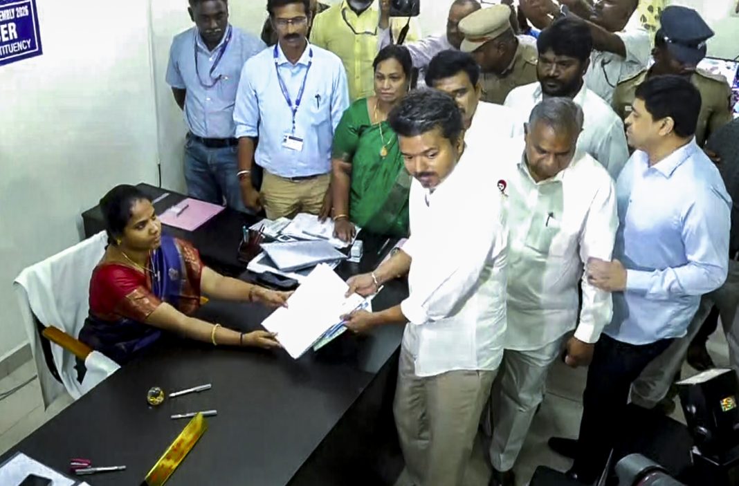 Chennai, Mar 30: TVK chief, actor-politician Vijay on Monday filed his nomination to contest Assembly polls from Perambur constituency in Chennai and appealed to the people to give an opportunity to his party TVK and vote for the party’s whistle symbol on April 23.